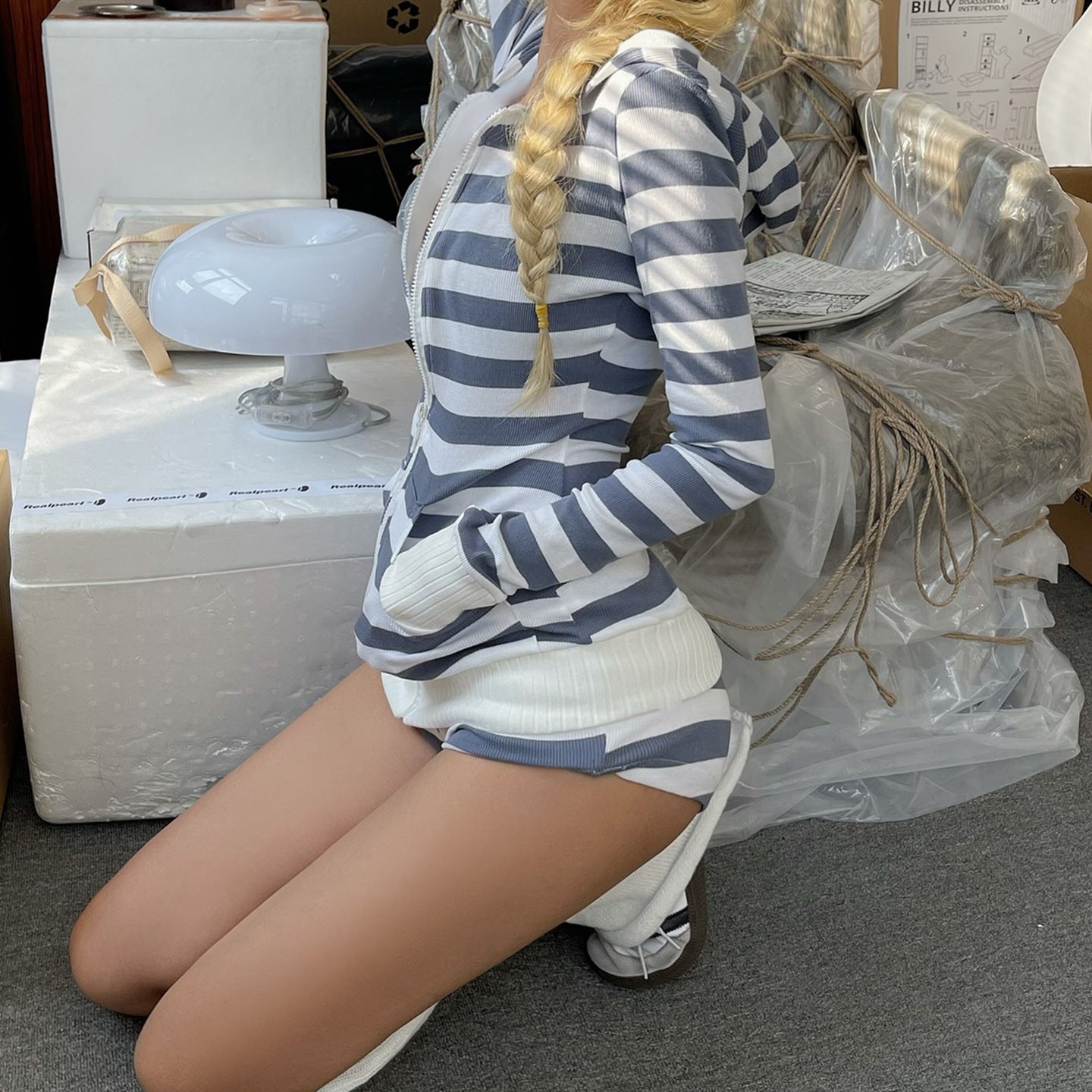 Striped contrasting hooded zipper top sweatshirt cardigan